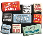 De metalen deur van je koelkast is een ideaal magneetbord. Dat weet iedereen en iedereen wil wel eens een notitiebriefje, een herinnering, een bericht, een ansichtkaart, een afspraak, een foto of een krantenknipsel ophangen. In de keuken komt iedereen en dat is dus de perfecte plek. Wat vaak ontbreekt zijn aantrekkelijke magneten die goed houden en er ook nog eens decoratief uitzien. Net zoals de grappige, 9-delige Word Up your Life magneetset inclusief een praktische geschenkbox (70 x 93 x 20 mm).