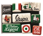 De metalen deur van je koelkast is een ideaal magneetbord. Dat weet iedereen en iedereen wil wel eens een notitiebriefje, een herinnering, een bericht, een ansichtkaart, een afspraak, een foto of een krantenknipsel ophangen. In de keuken komt iedereen en dat is dus de perfecte plek. Wat vaak ontbreekt zijn aantrekkelijke magneten die goed houden en er ook nog eens decoratief uitzien. Net zoals de grappige, 9-delige Vespa the Italian Legend magneet set inclusief een praktische geschenkbox (70 x 93 x 20 mm).